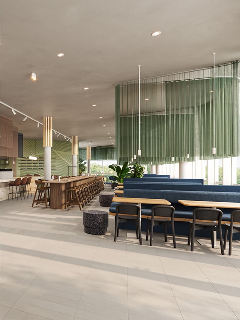 On the ground floor, you will find everything you need for a pleasant workday. A welcoming reception, as well as relaxation areas including a coffee bar, restaurant, informal seating options and a landscaped garden. The space connecting the Drive Tower and the Live Tower can accommodate a variety of commercial units. From a juice bar to a gym, and from a dry cleaning service to meeting rooms.